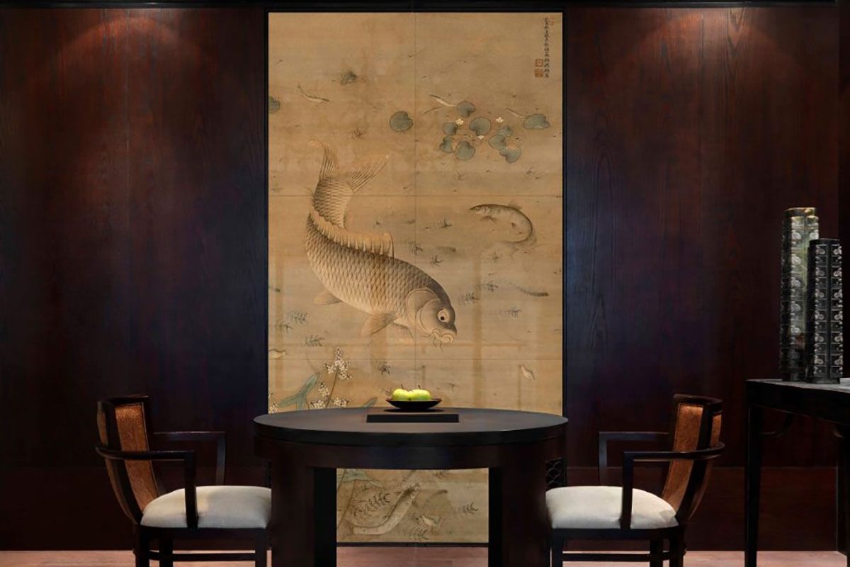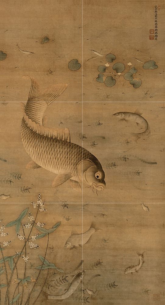 《魚藻圖》是作者繆輔任宮廷畫家期間,應皇室之邀而精心繪製的工筆畫。全幅以一條巨大的鯉魚為中心,群魚活潑自如的遊嬉,一派生機盎然。寓意“如魚得水”,用來祝福工作和生活和諧美滿,也象征富貴,意寓年年有餘。